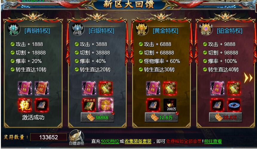 游戏内共有青铜、百眼、黄金、铂金、钻石五个特权可免费白嫖,通过收集装备套装激活图鉴即可免费领取!