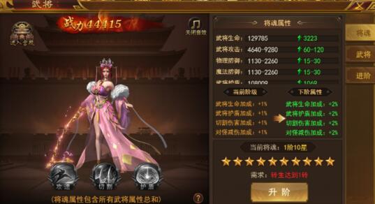 1、将魂的属性和战力为所有武将属性总和,可以使用任意已激活的武将外观