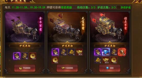 2. 玩家可花费金币/元宝/钻石选择镖车档次,档次越高,押镖完成的奖励越高。