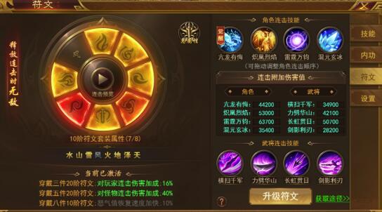 1、镶嵌符文可提升角色、武将的基础属性和连击技能附加伤害值