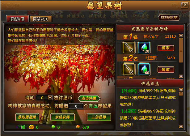 7月16日7点-7月23日7点,玩家在活动期间可以使用许愿币对树身进行许愿,许愿币可以在四级、五级活跃度宝箱以及圆梦礼包中获得。玩家获得的成熟许愿果不少于8000个且在许愿排行榜排行前3的玩家可以获得树身回馈的超级大奖。同时许愿获得的许愿果可以在愿望兑现中进行抽奖或者兑换奖励。