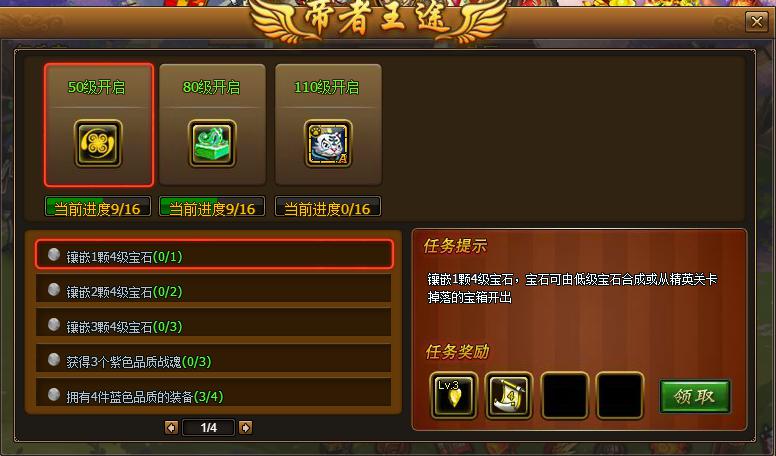 玩家每达到指定等级,即可进行帝者王途所提供的要求,完成要求后可获得对应奖励。