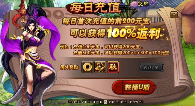 9月30日7点-10月9日7点,玩家在每日首次充值的前200元宝可以获得100%返利