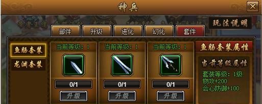 神兵系统新增套件功能,将神兵的部件放入套件功能内激活,凑齐套件后能够获得对应属性收益。套件升级后套件套装的属性也会增加。