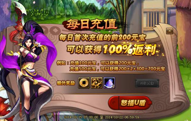 10月15日7点-10月22日7点,玩家在每日首次充值的前200元宝可以获得100%返利