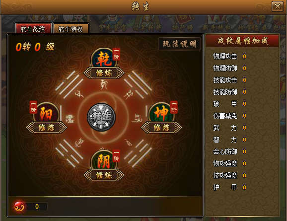 转生后每提升1级角色等级,即可获得血脉丹,血脉丹用于修炼转生战纹, “阴”“阳”“乾”“坤”四种战纹所提供的属性各不同,修炼成功后可获得相应属性的加成。