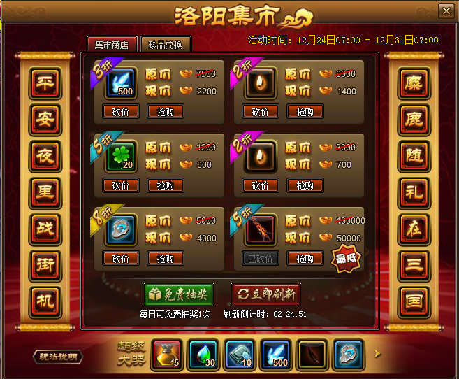 12月24日更新后—12月31日7点,玩家可以在洛阳集市购买道具物品,集齐对应的字,可在洛阳集市珍品兑换中兑换豪华大礼.,本次集字活动可兑换《圣诞套装》系列幻甲