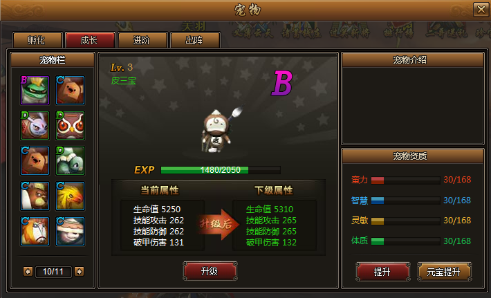 点击【元宝提升】按钮可花费元宝提升宠物资质