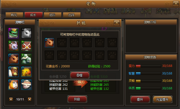 同时,升级面板的宠物即可获得相应经验。