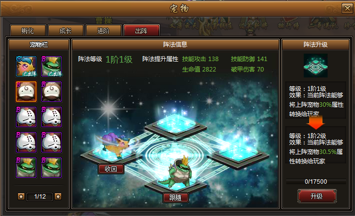 阵法等级越高,宠物属性转换为人物属性的百分比越高。