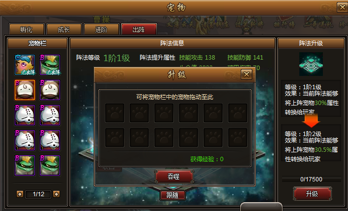 将宠物栏内的宠物放入阵法吞噬界面后点击吞噬即可获得相应阵法经验。