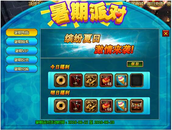 6月23日0点-6月29日23点59分,玩家可以在每日俸禄中免费领取“夏日派对礼包”。