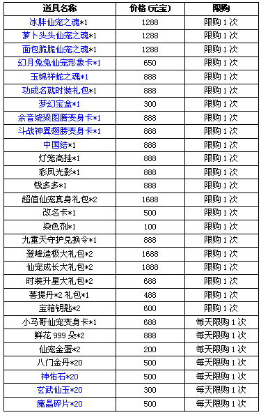 【活动内容】活动期间,玩家可以超值价格购买以下珍贵道具,数量有限,勿错失良机。