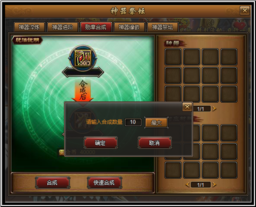 在神器祭坛“勋章合成“页签中,已可对大量勋章进行快速合成。在合成时只需输入合成数量,即可在最短的时间内获得所需的勋章。