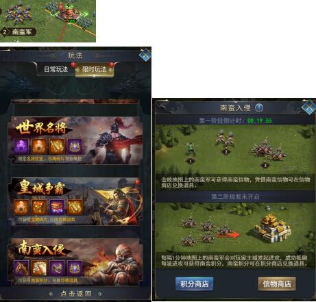 第二阶段持续40分钟,此时每隔1分钟会有一波南蛮军向玩家主城进攻,防守成功可获得积分奖励;防守失败则不会有下一波南蛮军攻城,连续防守40波南蛮军攻城,同国成员可获得一份共享奖励。