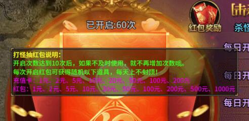 该玩法很简单,每击杀20只怪,即可获得1次红包开启机会。一般是累计10次在统一开,这样也便于我们安心挂机。