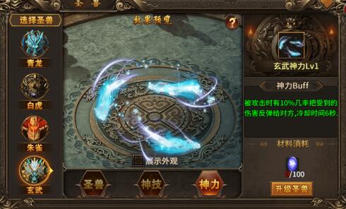 玄武神力:被攻击时有10%几率把收到的伤害反弹给对方,冷却时间6秒