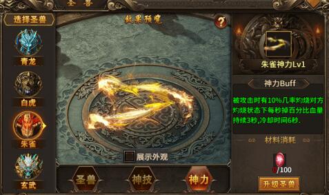 朱雀神力:被攻击时有10%几率灼烧对方,灼烧状态下美妙掉百分比血量,持续3秒,冷却时间6秒