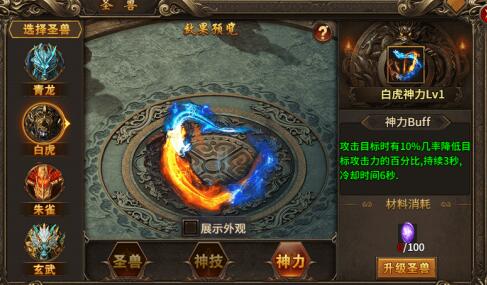 白虎神力:攻击目标时有10%几率奖励目标攻击力的百分比,持续3秒,冷却时间6秒