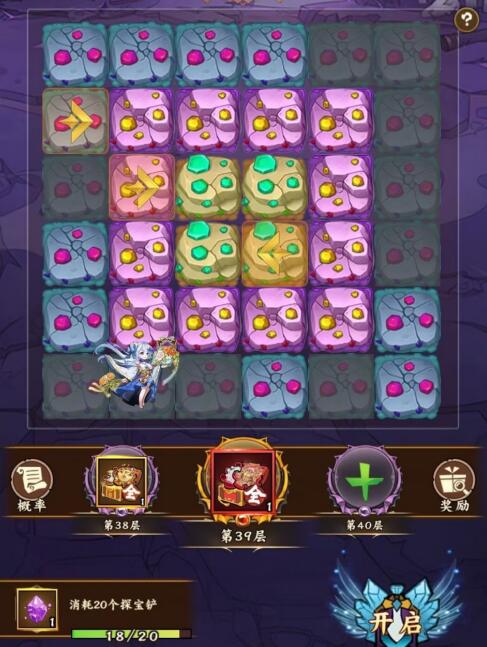 主要拿各种养成资源的活动,每次开启消耗1探宝铲随机移动1格(同圈之内到处跳,不是往相邻的格子走),移动到带箭头的格子可前往下一圈,内圈箭头进入下一层。每消耗20个探宝铲给1秘宝遗块。