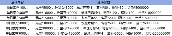 2、单日累计充值达到相应额度都可以获得对应的返利,达到高档位可同时领取低档位奖励,每个玩家每档仅限领取一次。
