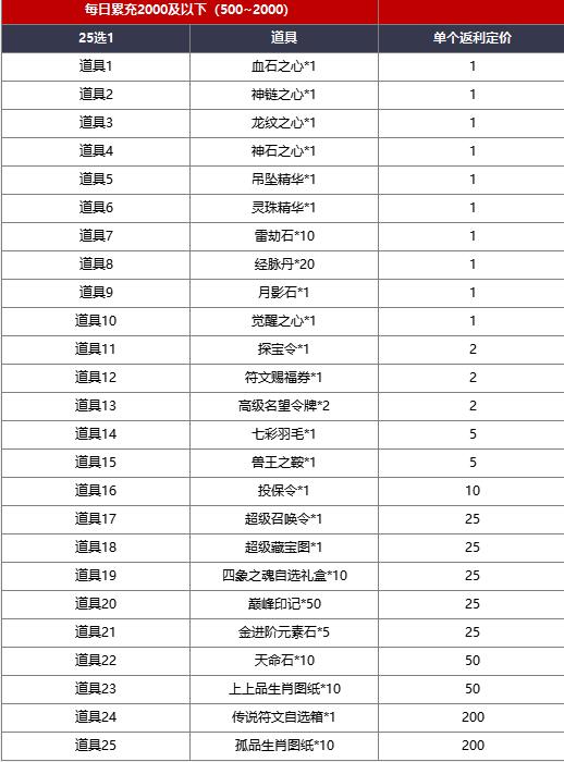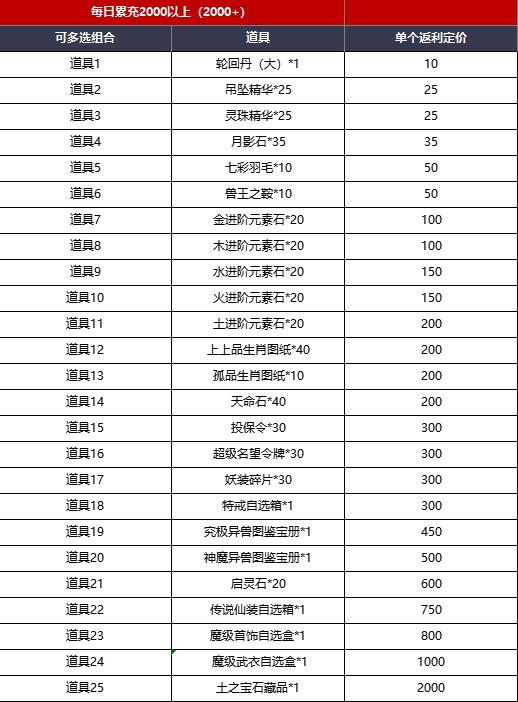 3、单日累充2000以上的档位,道具可多选,在额度价值内玩家可任意搭配,2000及以下的只能选定一种道具全额领取,不足的余额也无法留待下次使用。