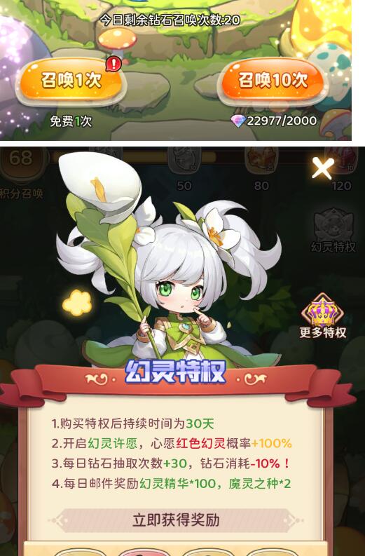 每天都有免费召唤次数和钻石召唤次数,建议直接撸满。购买【幻灵特权】可以开启幻灵抽奖,增加心愿红色幻灵概率,还可以增加钻石抽取次数,减少钻石消耗。