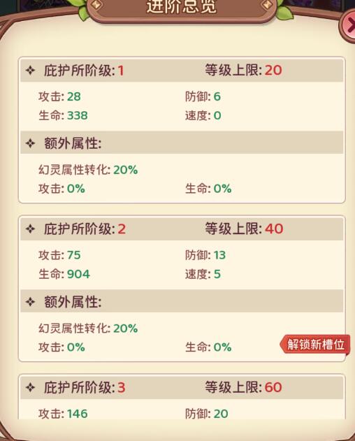 3、庇护所进阶不仅可以获得基础属性,达到指定阶数时还可以提升幻灵属性转化率和攻击/生命百分比属性加成。到达对应等级时会解锁上阵幻灵槽位