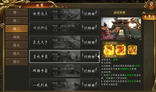 活动说明:角色200级以上可参与,前往皇城击杀敌对玩家可获得个人军功,攻城时间击杀皇宫内其它行会所有玩家则占领皇宫。