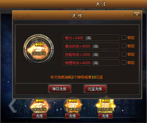 新增玄阳、黄幻、灵隐三种暗金神策,玩家可以通过运营活动获得或者花费神符在兵法商城中进行兑换。